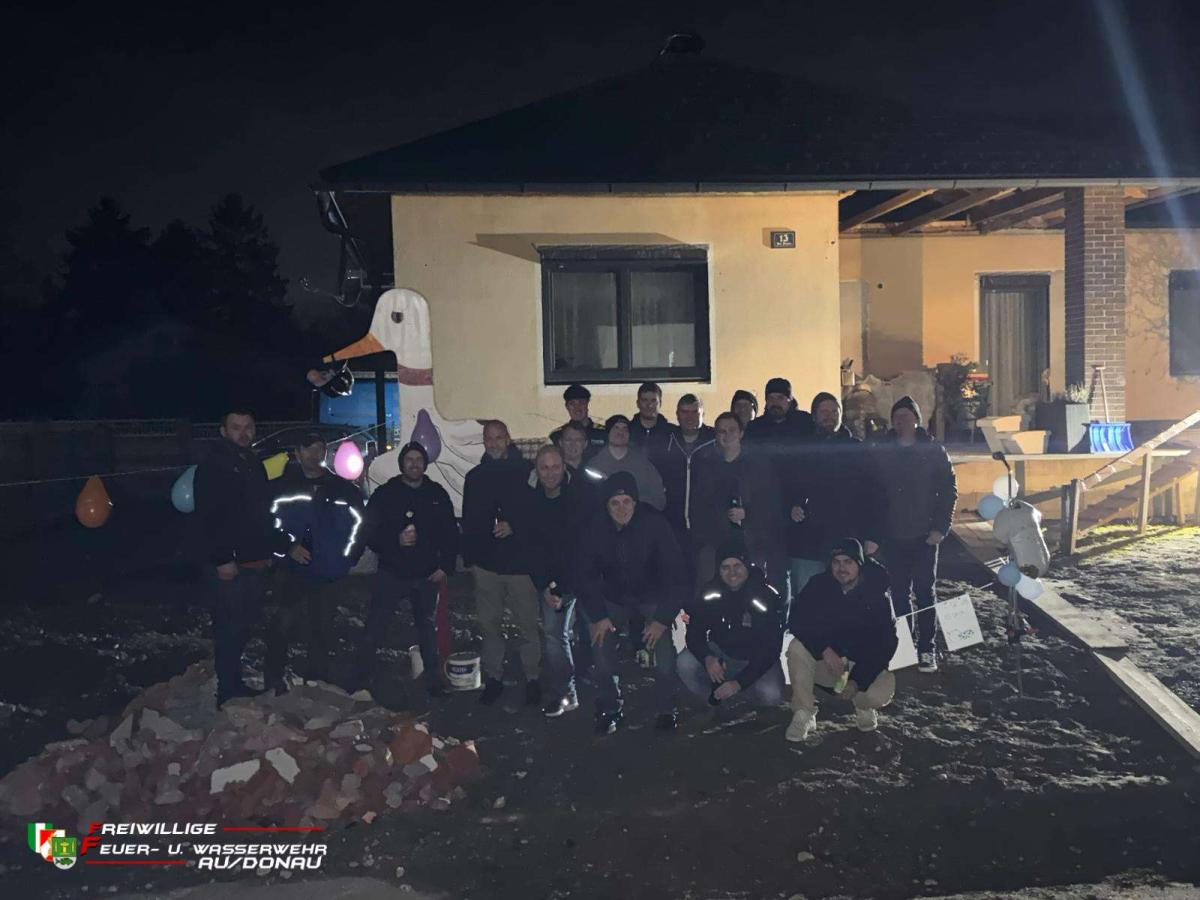 Aus diesem freudigen Anlass stellten ihnen die Kameraden der Feuerwehr Au/Donau am Samstag den Feuerwehrstorch auf, und stießen auf den kleinen Sohnemann an!