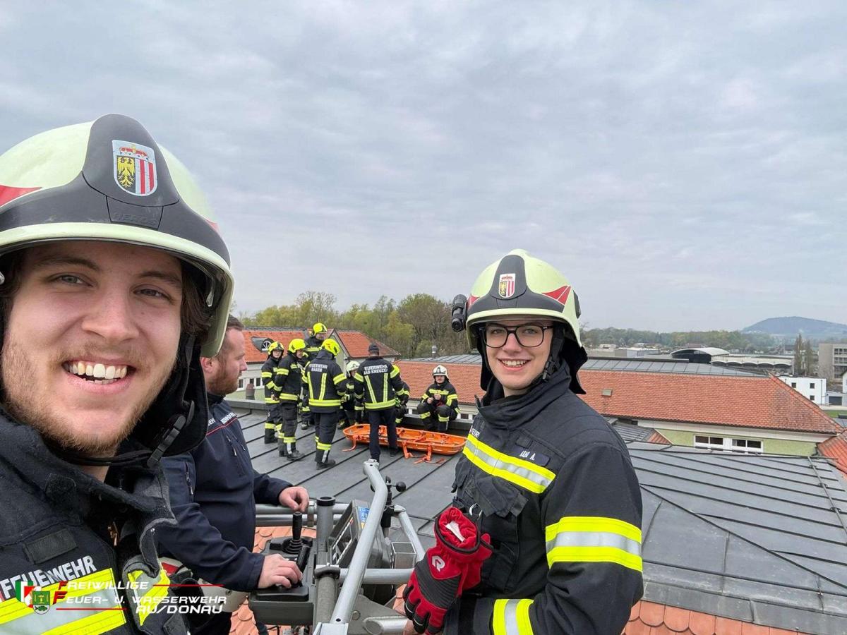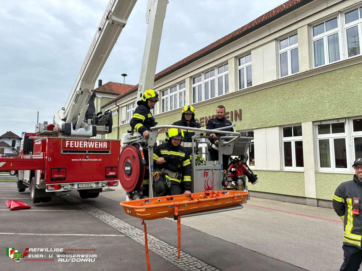 Auch die Höhenretter der FF Arbing, sowie die Kameraden aus Mauthausen mit der Teleskopmastbühne nahmen an diesem Lehrgang teil, um auch die Rettung von verunfallten Personen aus Höhen und Tiefen zu veranschaulichen.